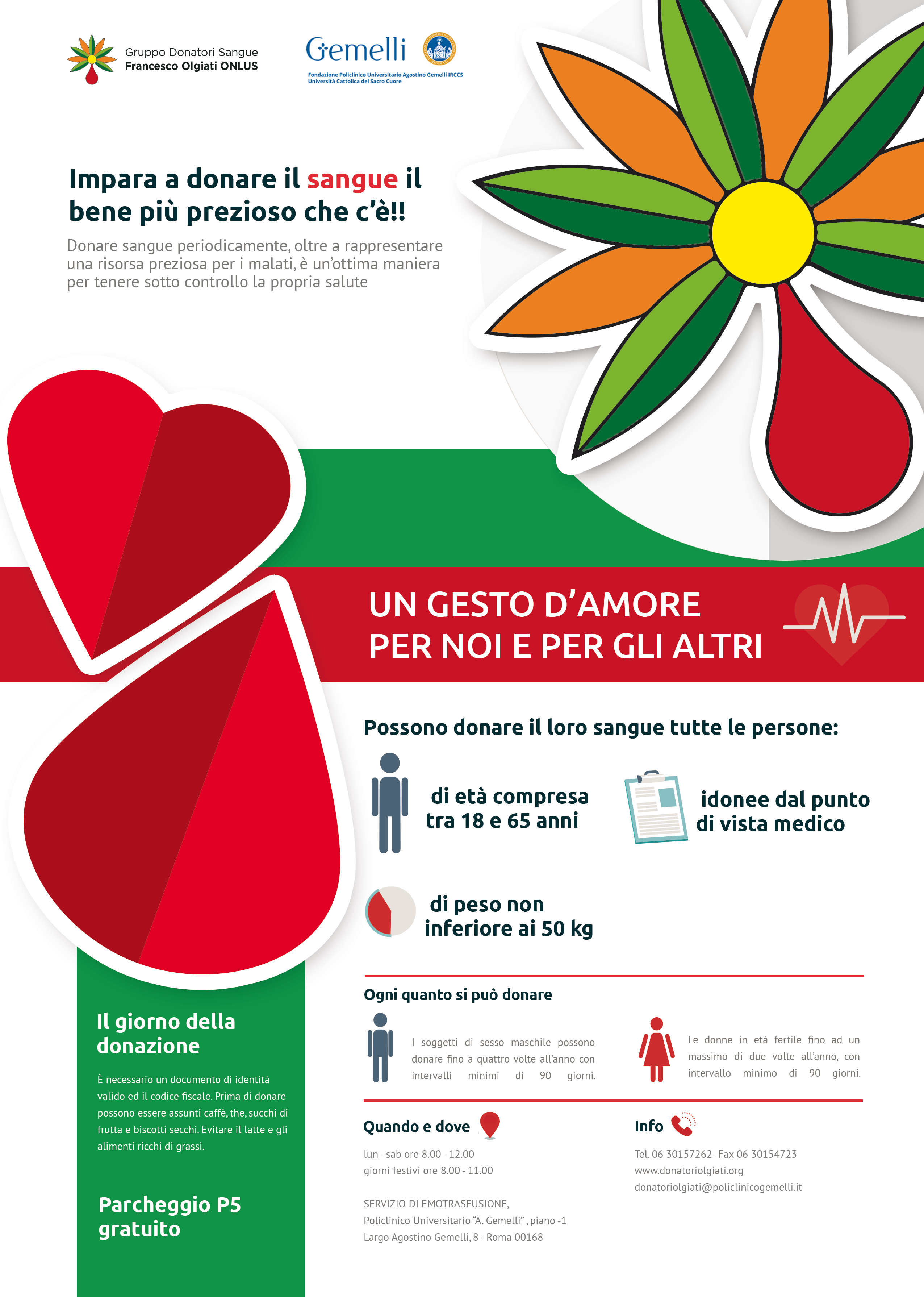 Dal 1980 il Policlinico Agostino Gemelli può contare sulla folta schiera di “angeli” del gruppo donatori di sangue “Francesco Olgiati” che in maniera volontaria e gratuita contribuiscono generosamente a curare piccoli e grandi pazienti che hanno bisogno di sangue, plasma o piastrine.